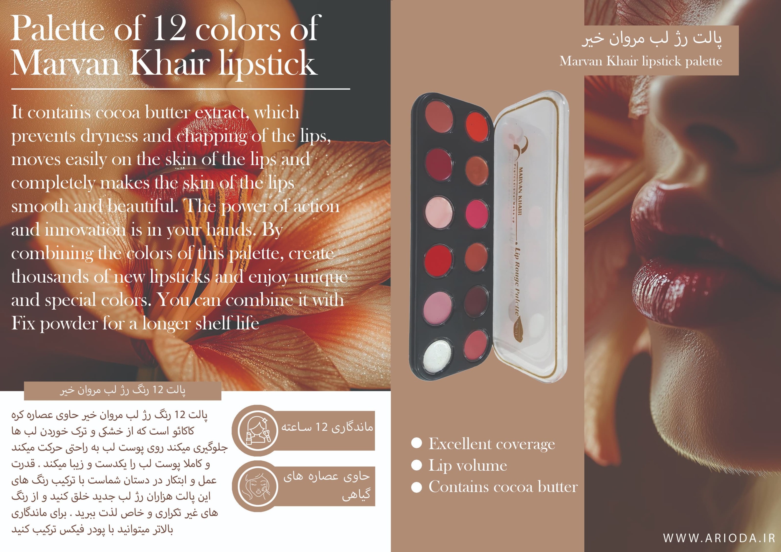 پالت 12 رنگ رژ لب مروان خیر قدرت و ابتکار در دستان شماست تا با ترکیب رنگها، هر روز ظاهر جدید و جذابتری بسازید.